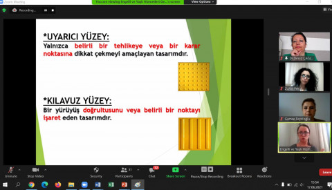 Aile ve Sosyal Hizmetler Bakanlığı Erişilebilirlik Daire Başkanı ve aynı zamanda Üniversitemiz Mimarlık Ve Tasarım Fakültesi öğretim üyesi Dr. Deniz Çağlayan Gümüş ile Erişebilirlik Daire Başkanlığı'ndan Tuba Sayan ve Gamze Feyzioğlu'nun 17 Haziran 2021 tarihinde çevrimiçi olarak gerçekleştirdikleri eğitim kapsamında, Yapı ve Teknik İşler Daire Başkanlığı'nın mimar ve mühendislerine erişilebilirlik mevzuatında dikkate alınması gereken önemli hususlar, tasarımlardaki ölçütlerde ve proje çizimlerinde yer alması gereken erişilebilirlik detayları hakkında önemli teknik bilgiler sunuldu. Eğitime katılan Engelli Öğrenci Birimi Koordinatörü Öğr. Gör. Zuhal Pek, "Erişilebilirliğin hayat bulmasını ve herkesin bağımsızca yaşaması gayesini içselleştirmiş ve bunu profesyonel çalışma ilkeleri ile hayata geçirmiş, Bakanlığın kıymetli Daire Başkanı Dr.