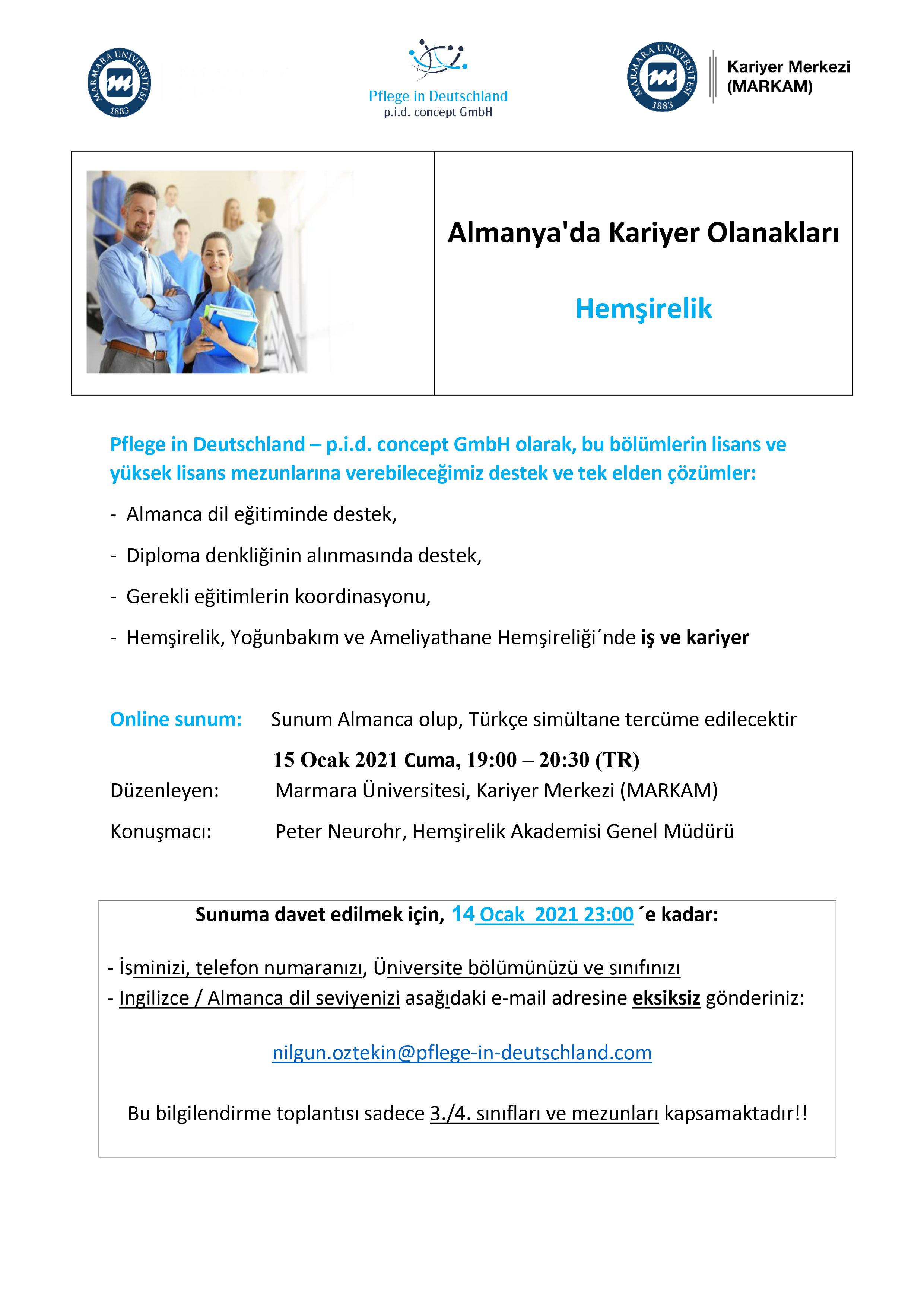 Kariyer Merkezi (MARKAM) ve Pflege in Deutschland concept GmbH işbirliği ile "Almanya da Kariyer Olanakları Hemşirelik " online sunumu 15 Ocak 2021 19:00-20:30 TR saatleri arasında yapılacaktır.