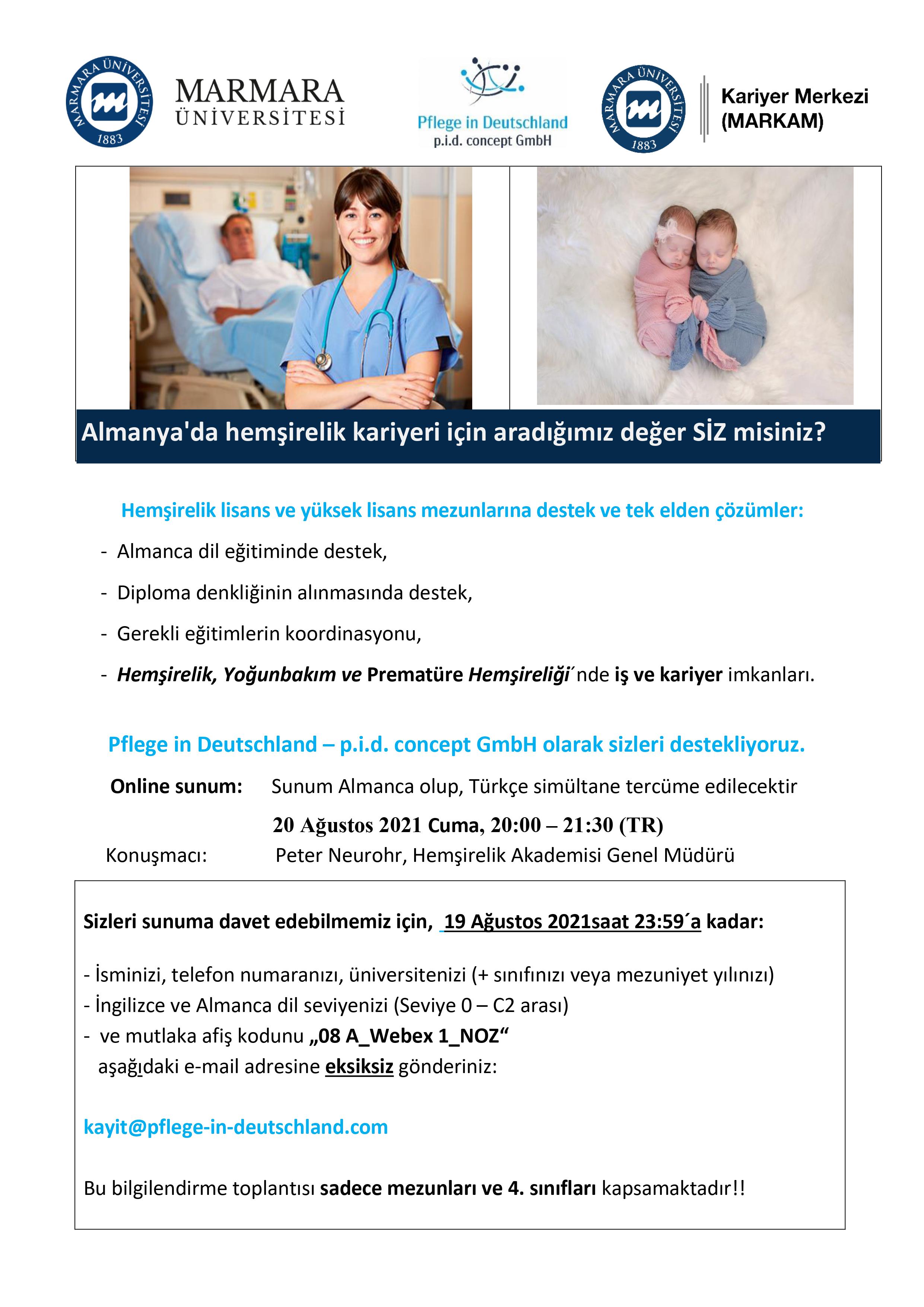 Kariyer Merkezi (MARKAM) ve Pflege in Deutschland concept GmbH işbirliği ile "Almanya'da Hemşirelik Kariyeri İçin Aradığımız Değer Siz Misiniz? Online Sunum" semineri 20.08.2021 Cuma 20:00-21:30 (TR) saatleri arasında yapılacaktır.
