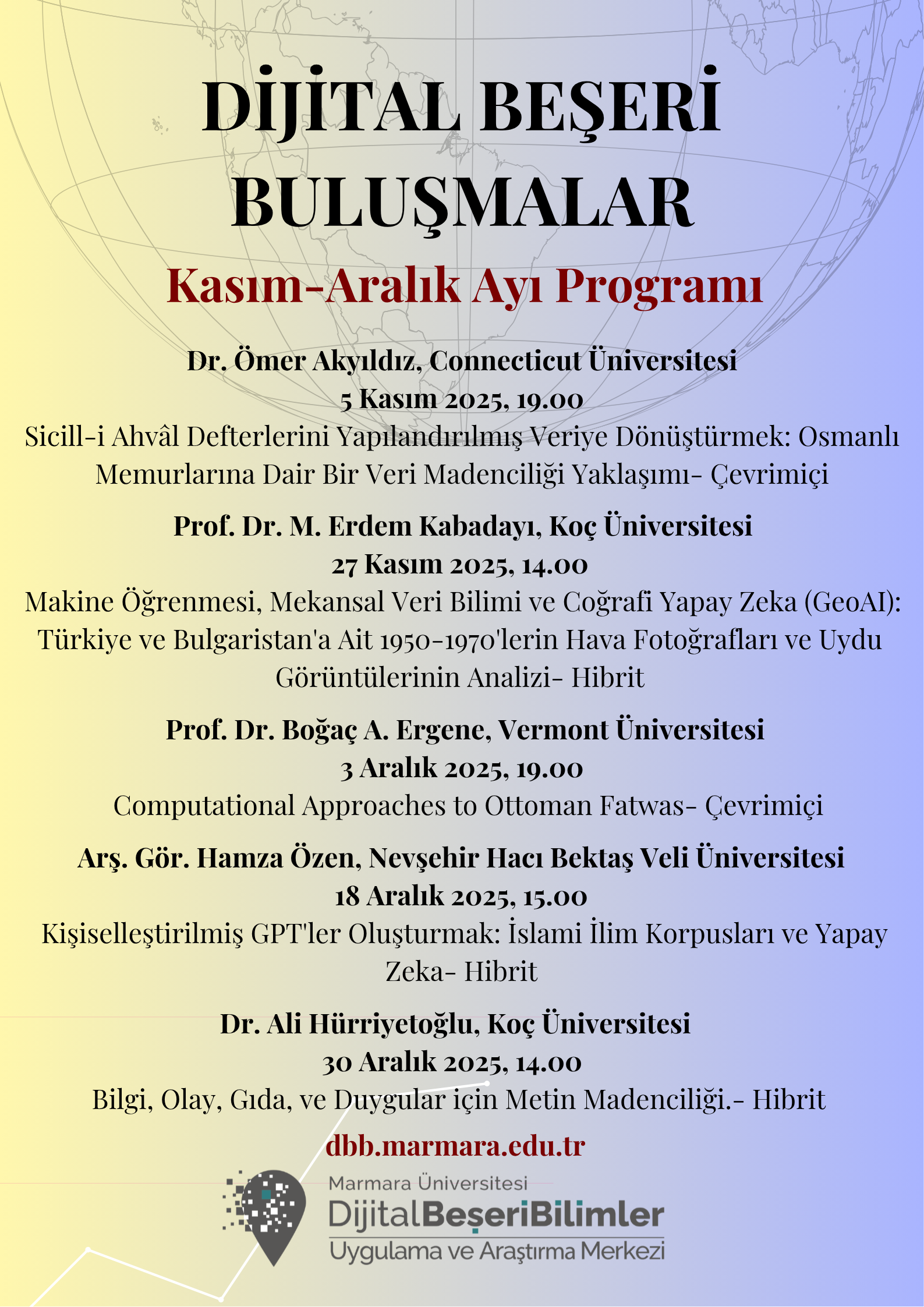 Üniversitemiz Dijital Beşerî Bilimler Uygulama ve Araştırma Merkezi Merkezi bünyesinde 3 yıldır devam eden "Dijital Beşeri Buluşmalar" konuşma serisinin Kasım ve Aralık 2025 etkinlikleri yapılacaktır. Detaylı bilgi ektedir.