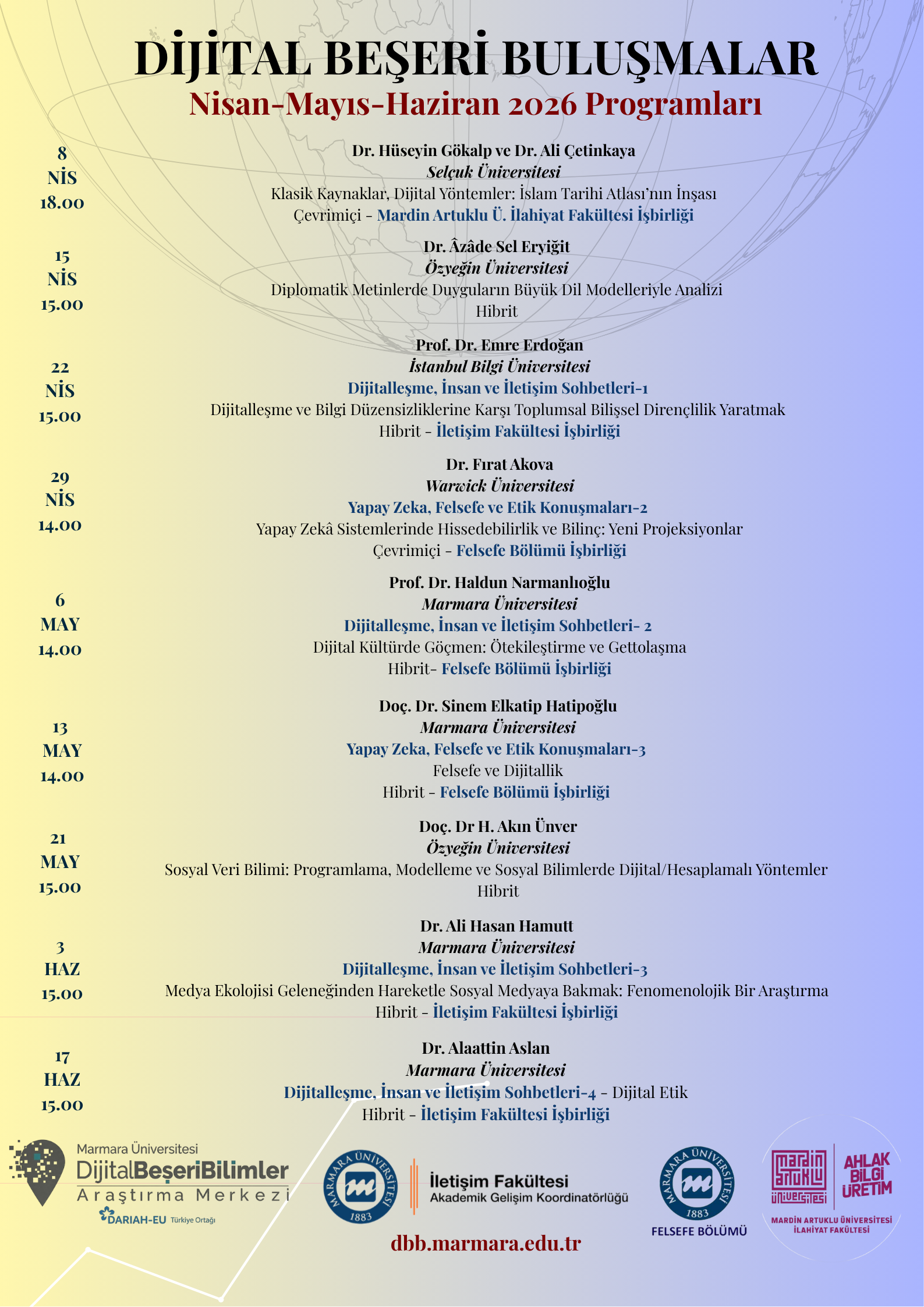 Dijital Beşeri ve Sosyal Bilimlerdeki gelişmeleri alana ilgi duyan kişilerle hep birlikte konuşmak, tartışmak ve tecrübe paylaşımı yapmak üzere Dijital Beşeri Buluşmalar ‘da bir araya geliyoruz. Özel davetlilerimizin de olacağı buluşmalarımızda, dijital yöntemlerin uygulandığı çalışmaların imkan ve kısıtlarını detaylıca ele alıyoruz.