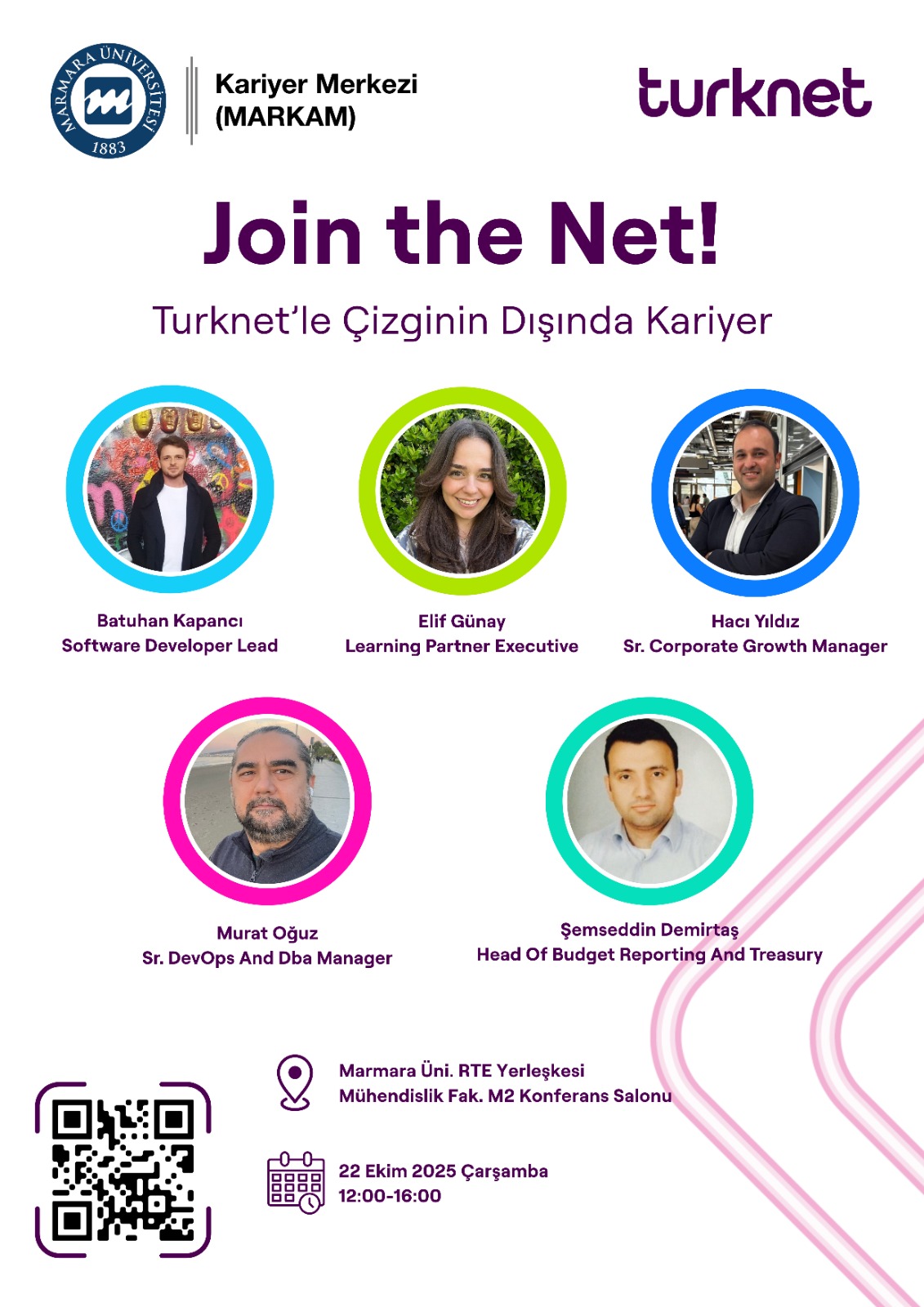 Üniversitemiz Kariyer Merkezi (MARKAM) ve TÜRKNET iş birliğiyle ile düzenlenen, firma görevlilerinin konuşmacı olarak katılım sağlayacağı Join the Net ‘'Türknet' le Çizginin Dışında Kariyer'' semineri, 22 Ekim 2025 Çarşamba, saat:12:00-16:00 arası Marmara Üniversitesi RTE Yerleşkesi Mühendislik Fakültesi M2 Konferans salonunda yapılacaktır.