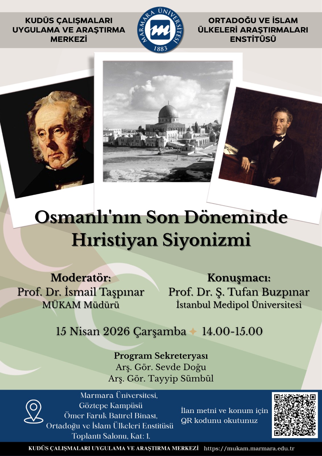 Üniversitemiz Kudüs Çalışmaları Uygulama ve Araştırma Merkezi (MÜKAM) tarafından 2026 Konferanslar Dizisi kapsamında düzenlenen ve İstanbul Medipol Üniversitesi öğretim üyesi Prof.Dr. Ş. Tufan Buzpınar'ın konuşmacı olarak katılacağı ‘Osmanlı'nın Son Döneminde Hıristiyan Siyonizmi' adlı konferans etkinliği, 15 Nisan 2026 tarihinde, Çaramba günü saat: 14.00 'te, M.Ü. Göztepe Kampüsü Ömer Batırel Binası'nda 1. kattaki konferans salonunda gerçekleştirilecektir.