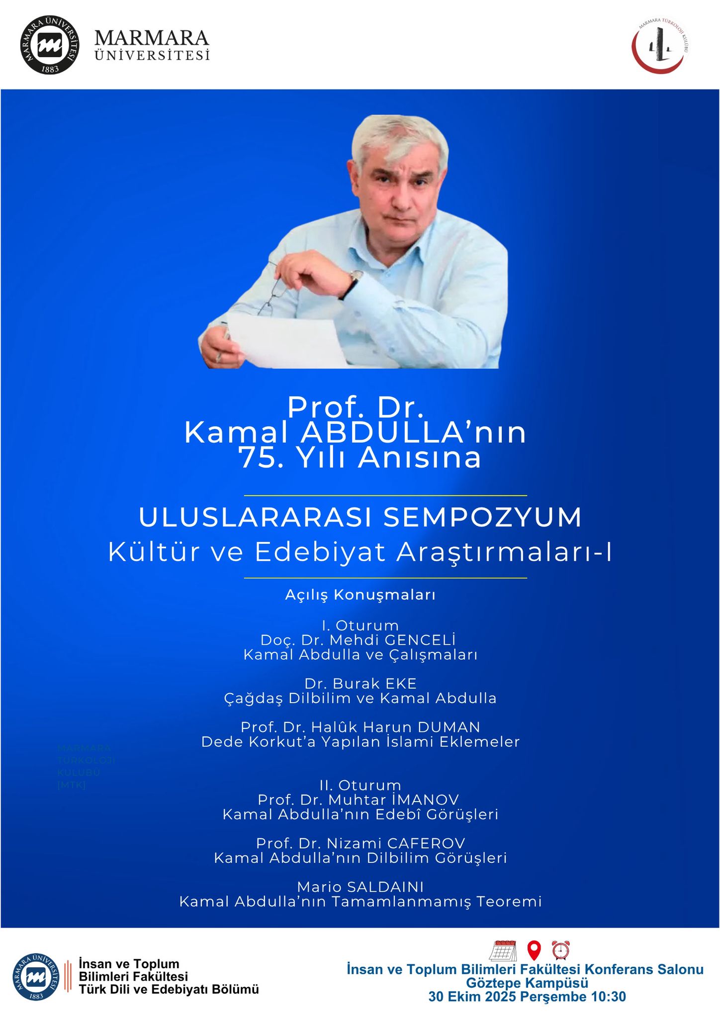 30 Ekim Perşembe 10.30'da da Prof. Dr. Kamal Abdulla'nın 75. Yılı Anısına yine Marmara Üniversitesi İnsan ve Toplum Bilimleri Fakültesi Türk Dili ve Edebiyatı Bölümü ve Marmara Türkoloji Kulübü (MTK) ortaklığıyla "Uluslararası Sempozyum Kültür ve Edebiyat Araştırmaları- I" adlı etkinlik yapılacaktır. Sözü edilen etkinliklerin afişleri ekte sunulmuştur.