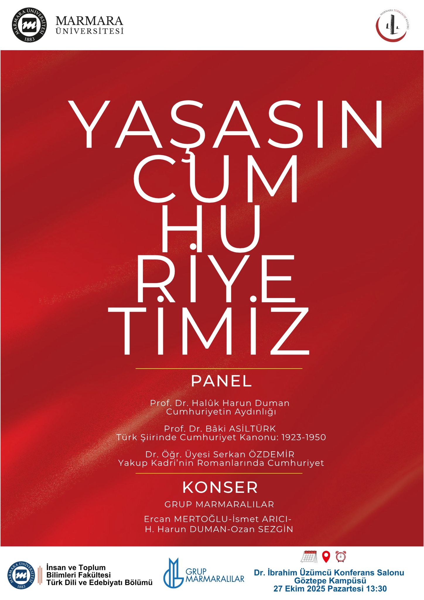Üniversitemiz İnsan ve Toplum Bilimleri Fakültesi Türk Dili ve Edebiyatı Bölümü ve Marmara Türkoloji Kulübü (MTK) iş birliğiyle 27 Ekim 2025 Pazartesi 13.30'da Dr. İbrahim Üzümcü Konferans Salonunda "Yaşasın Cumhuriyetimiz" konulu bir panel düzenlenecek ve ardından Grup Marmaralılar tarafından bir konser verilecektir.