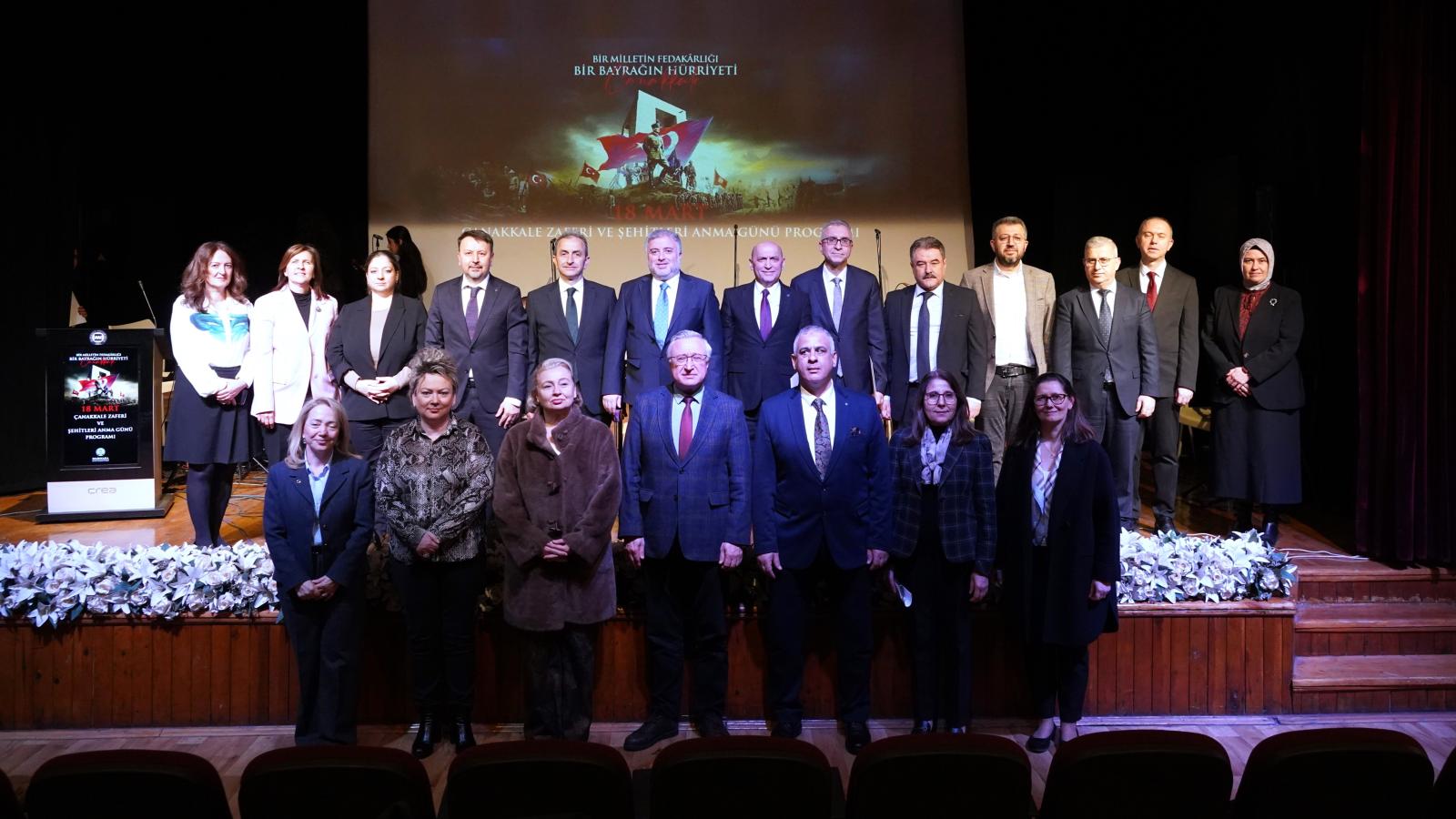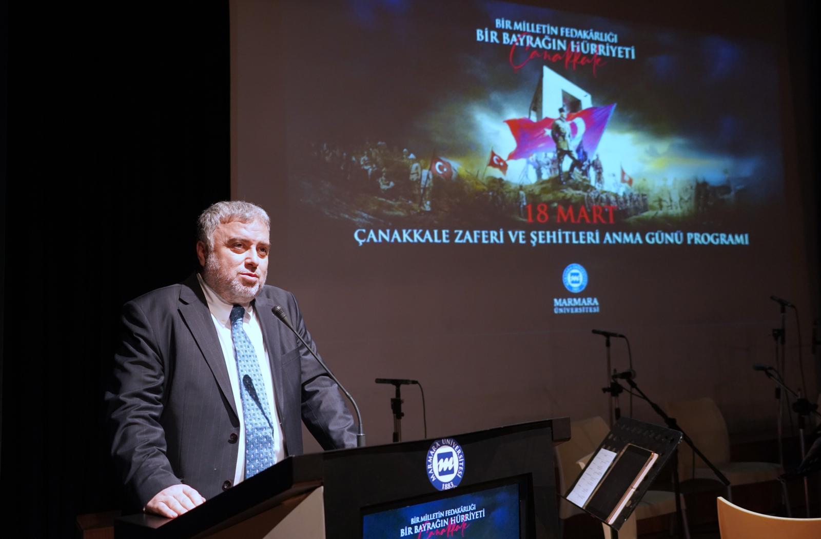 18 Mart Çanakkale Zaferi ve Şehitleri Anma Günü kapsamında düzenlenen “Bir Milletin Fedakârlığı, Bir Bayrağın Hürriyeti; Çanakkale” başlıklı anma töreni, Marmara Üniversitesi Göztepe Yerleşkesi Dr. İbrahim Üzümcü Konferans Salonu’nda saat 11.00’de gerçekleştirildi. Törene, Marmara Üniversitesi Rektörü Prof. Dr. Mehmet Emin Okur, rektör yardımcıları Prof. Dr. Ümit Süleyman Şehirli ve Prof. Dr. Ayşin Satan ile Genel Sekreter Hasan Şahin, dekanlar, akademik ve idari personel katılım sağladı.