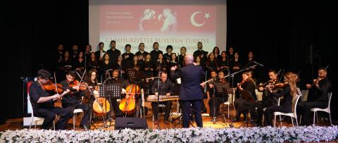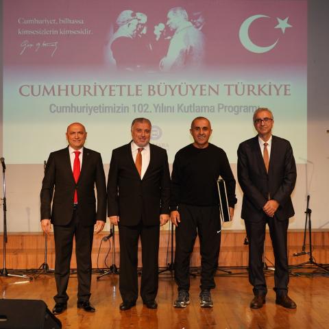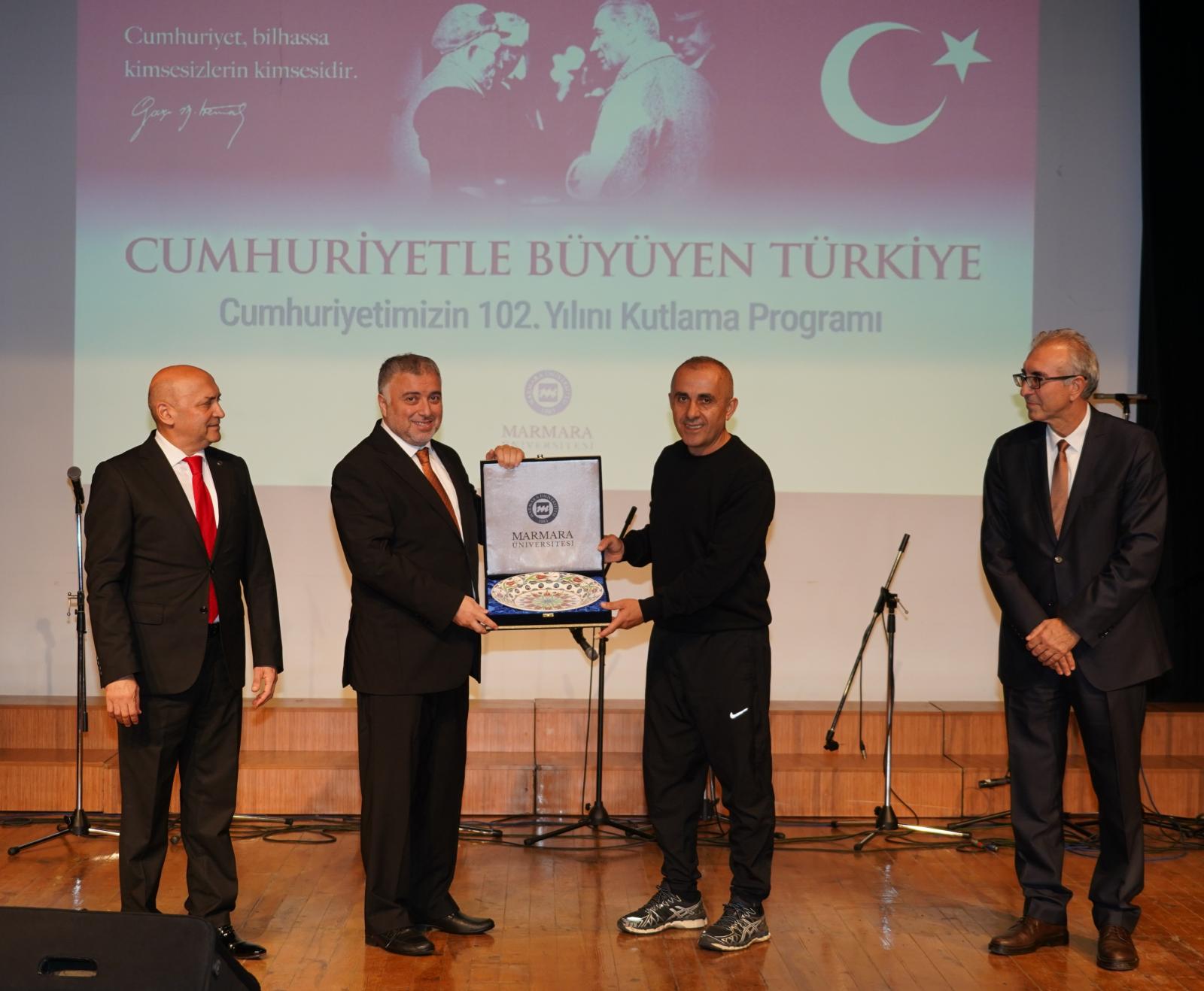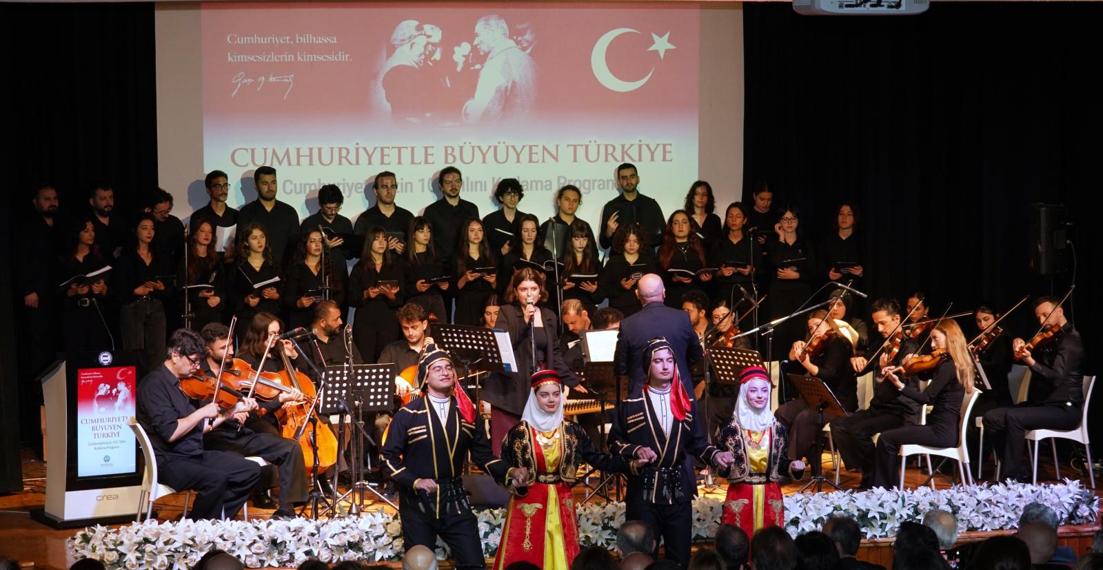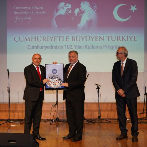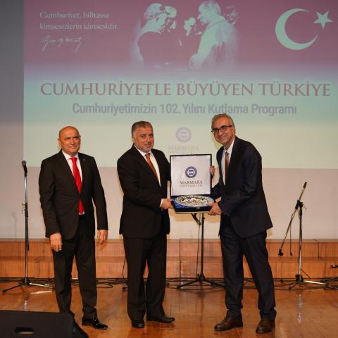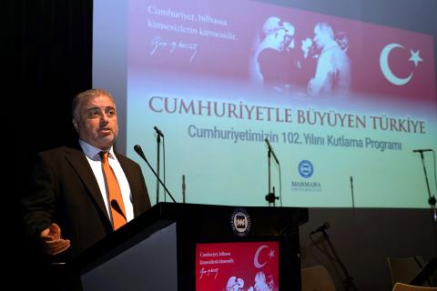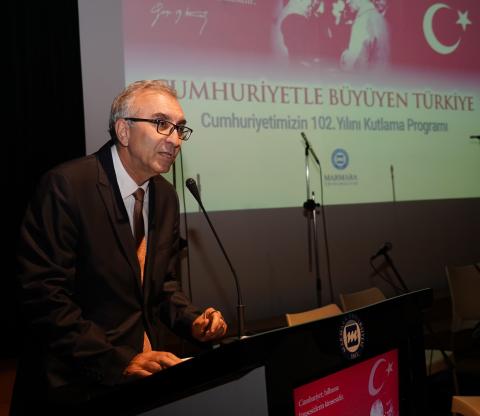 Cumhuriyetimizin 102. yılı, 28 Ekim Salı günü Marmara Üniversitesi Göztepe Yerleşkesi Dr. İbrahim Üzümcü Konferans Salonu’nda gerçekleştirilen “Cumhuriyetle Büyüyen Türkiye” temalı program kapsamında; sergi açılışı, konferans, konser ve halk oyunları gösterisiyle coşkuyla kutlandı. Programa Rektör Prof. Dr. Mehmet Emin Okur, rektör yardımcıları, senato üyeleri, akademik personel ve öğrenciler katıldı.