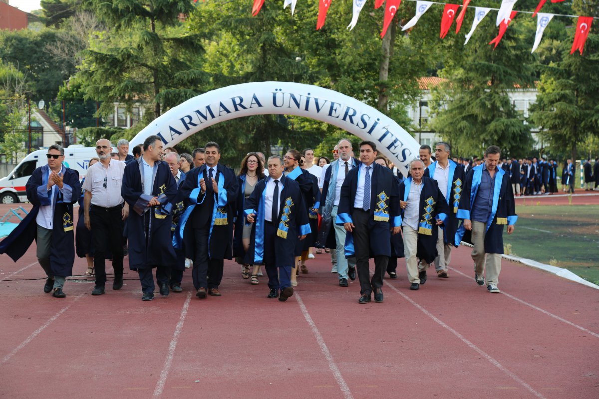 Mezuniyet Töreni, kortej yürüyüşü ile başladı. Öğretim üyelerini takiben sahne alan öğrenciler, tören alanında yerlerini aldılar.
