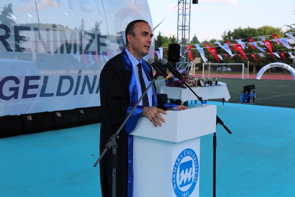 Saygı duruşu ve İstiklal Marşı’nın ardından Spor Bilimleri Fakültesi Dekanı Prof. Dr. Salih Pınar konuşma yaptı. Prof. Dr. Pınar konuşmasında; 44 yıllık tarihi olan fakülteden, 40. Dönem öğrencilerini mezun etmenin verdiği gururu ve mutluluğu paylaştı. Mezunları ve ailelerini kutlayan Pınar, mezun olan öğrenciler için yeni bir dönemin başladığını söyledi. Ayrıca, mezunların Türk sporuna kıvançla hizmet edeceğine, Marmara Üniversitesi ailesinin bir ferdi olarak branşlarında öncülük edeceklerine inandığını belirtti.